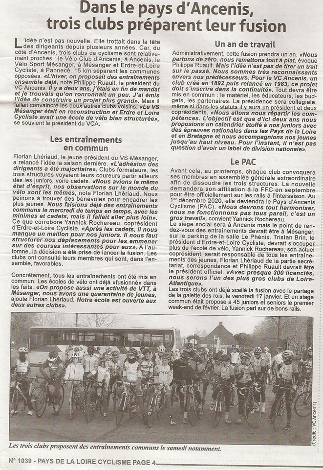 Ils en parlaient depuis de longues années. Tout récemment, les clubs cyclistes de Mésanger, Ancenis et Pannecé (Loire-Atlantique) ont fusionné pour créer le Pays-d’Ancenis cyclisme.
